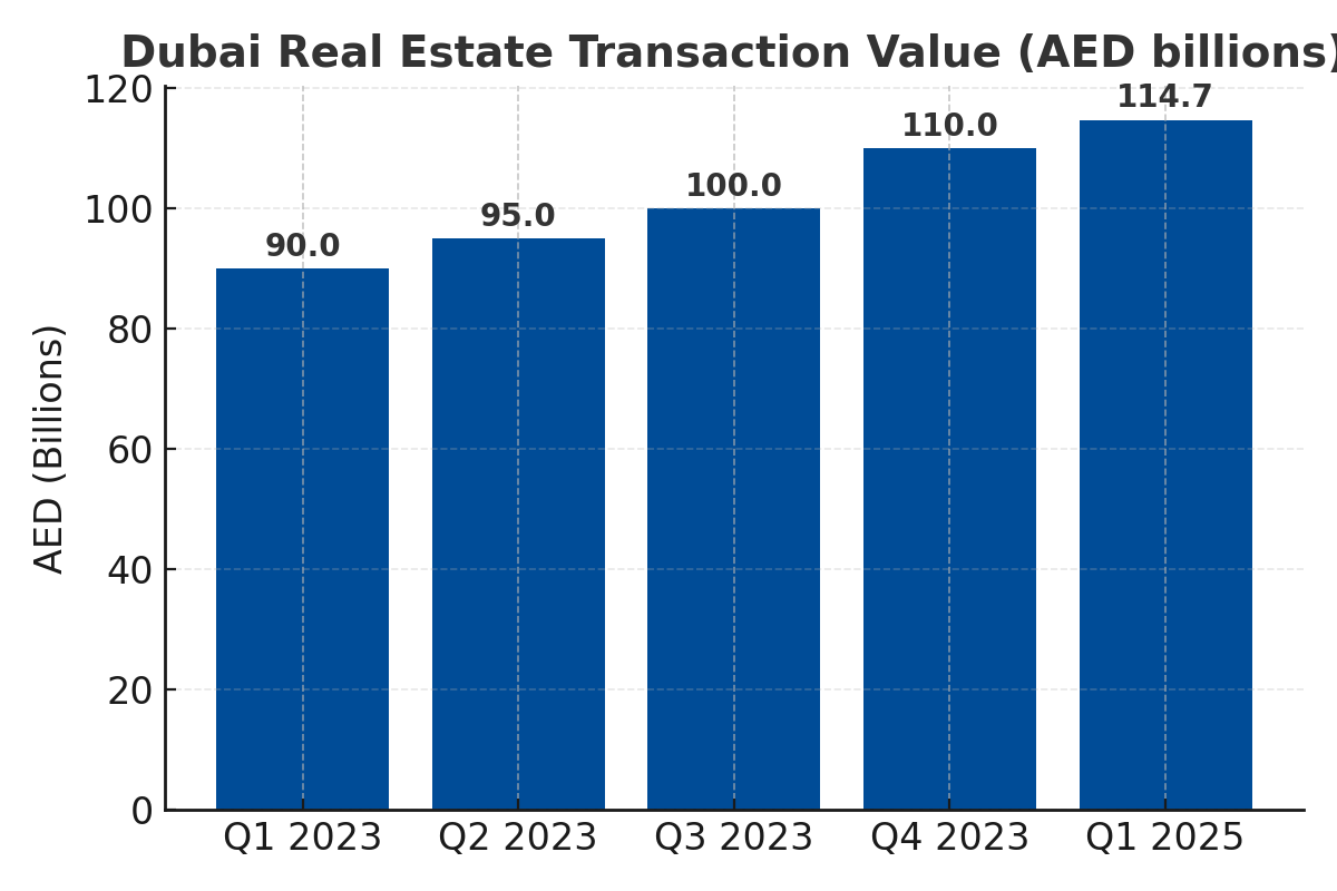 According to Q1 data, the city recorded over 43,000 real estate transactions worth AED 114.7 billion, setting a new benchmark for total market activity.